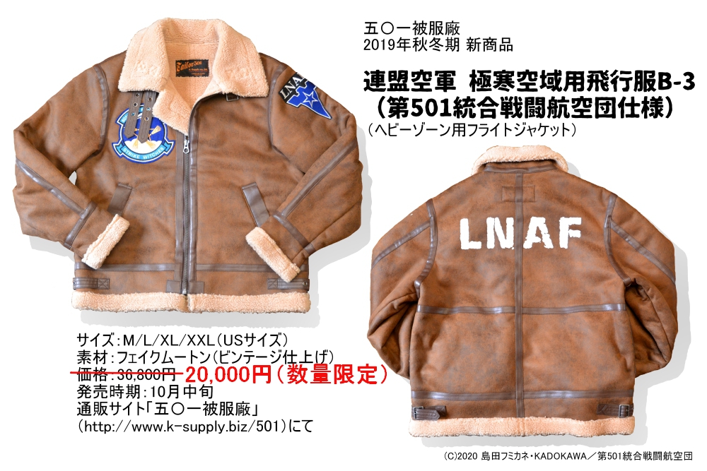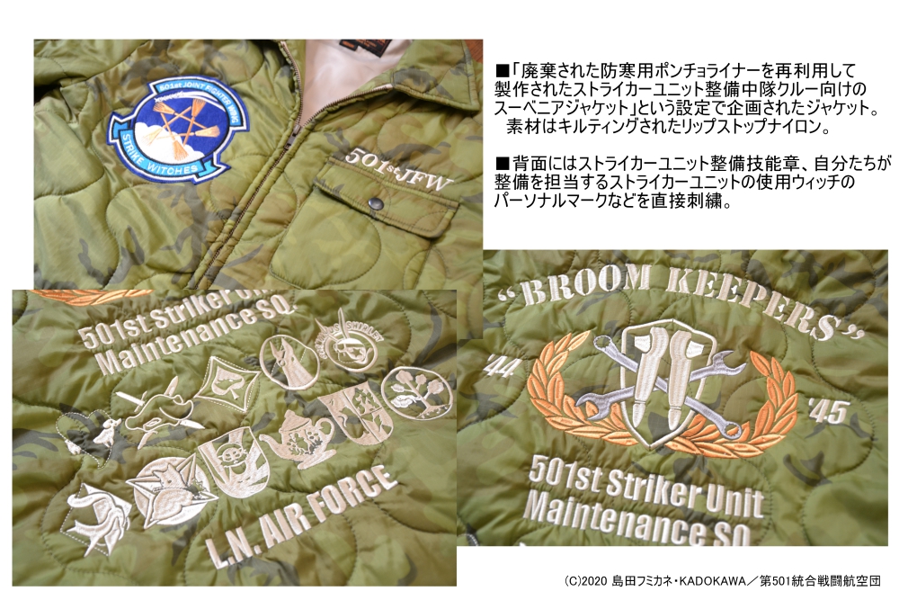 ■「アニメーション×リアルミリタリー」をテーマに弊社が企画・製作している「世界観グッズ」の中でも最大ボリュームのアイテムとなりました。新規製作の大判フェルト刺繍パッチや直接刺繍で表現したウィッチ達のパーソナルマークなど「カモジャケット」「B-3」どちらもきっとご満足頂ける商品に仕上がったと自負しております。お申し込みお待ちしております…!