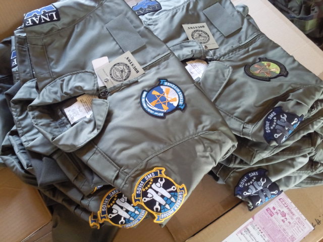 ■お待たせしております「BB20整備中隊グランドクルー用ジャケット」ですが、ジャケット本体は部隊パッチ縫い付け済のものが全受注分工場より仕上がって参りました。現在ダンボール箱が弊社の玄関を占拠しております。