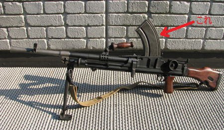 ■ペリーヌさんの愛銃、ブレン軽機関銃の弾丸を入れておく取り外し式の箱です。スプリングの力で弾丸が1発ずつガチャンガチャンと送り出されてくるので、その機構を指して名塚さんは「コンビニのペットボトルの棚みたい」と表現されてたんですね。