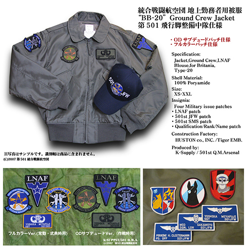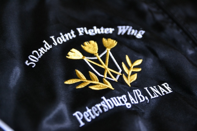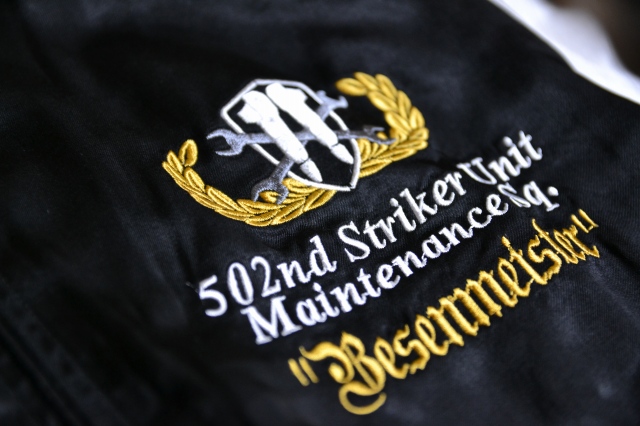 胸には502JFW部隊インシグニア、背面には飛行脚整備技能章と部隊名・配備基地名があしらわれています。