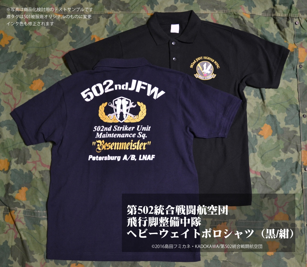 ■11月17日に生放送された「ブレイブウィッチーズ 扶桑皇国チャンネル 第502統合戦闘航空団広報活動(生)」にて初アナウンスとなりました、弊社「ブレイブウィッチーズ」ミリタリーアパレル第1弾、「502JFW飛行脚整備中隊クルー用ヘビーウェイトポロシャツ」の第一報をお届けします!