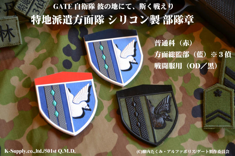 ■陸上自衛隊駐屯地内のPX等で、隊員さん向けに販売されているシリコン製部隊章(師団等標識)。それと同工場・同規格でアニメ「GATE」に登場する「特地派遣方面隊」の部隊章を作製しました。裏面はパイルアンドフック仕様のミリタリーワッペンです。