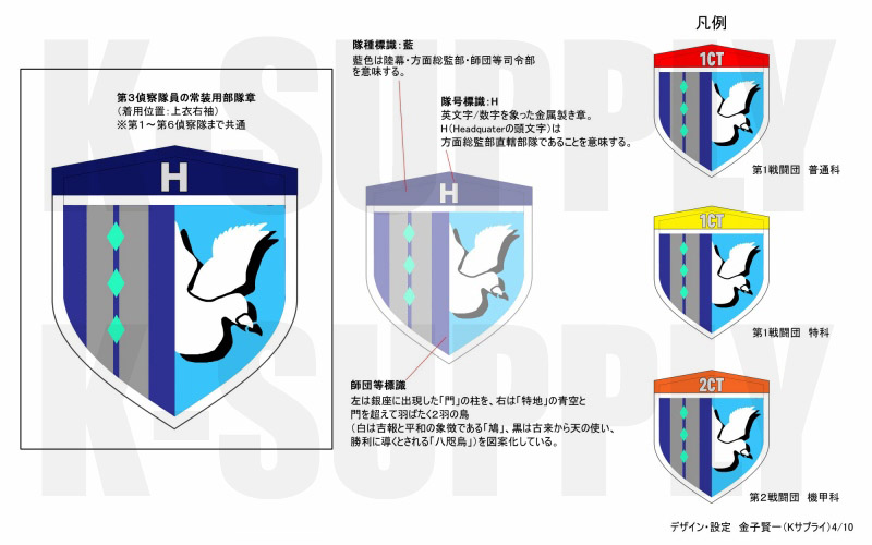 ■陸上自衛隊駐屯地内のPX等で、隊員さん向けに販売されているシリコン製部隊章(師団等標識)。それと同工場・同規格でアニメ「GATE」に登場する「特地派遣方面隊」の部隊章を作製しました。裏面はパイルアンドフック仕様のミリタリーワッペンです。